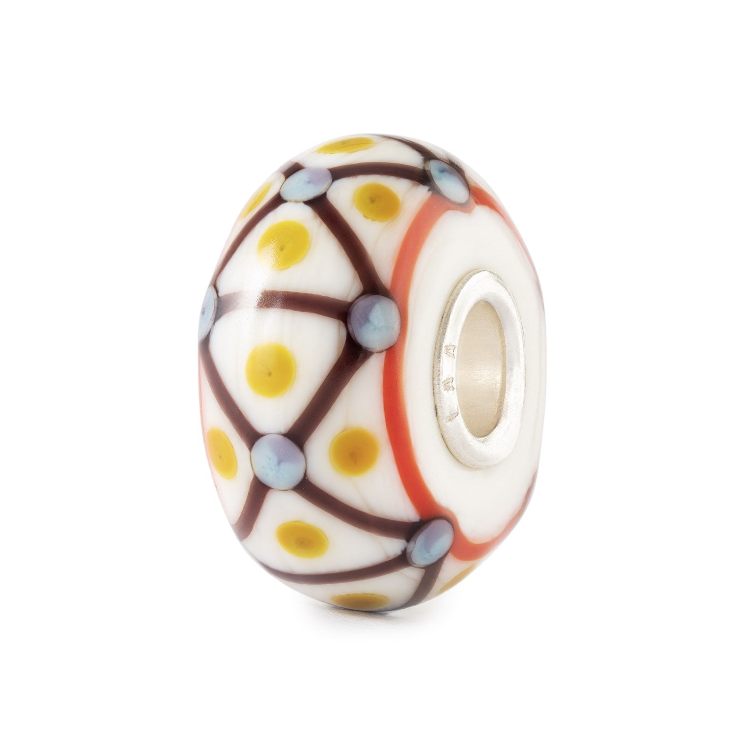 This glass bead has a classic shape and smooth surface. It is crafted in brown, orange, blue and yellow in the shape of dots and stripes on a white background. Subtle patterns and delicate details give it the feeling of a handcrafted woolen texture — comforting, familiar, and uniquely yours. A sterling silver core adds a refined finish, making it as enduring as it is radiant.